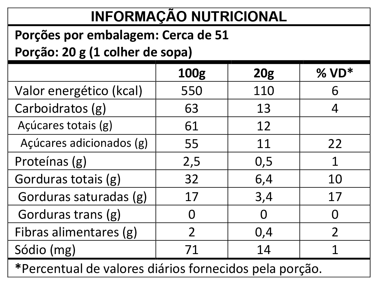 Açúcar, gordura vegetal, soro de leite em pó, cacau em pó, emulsificantes mono e diglicerídeos de ácidos graxos e lecitina de soja e aromatizantes.